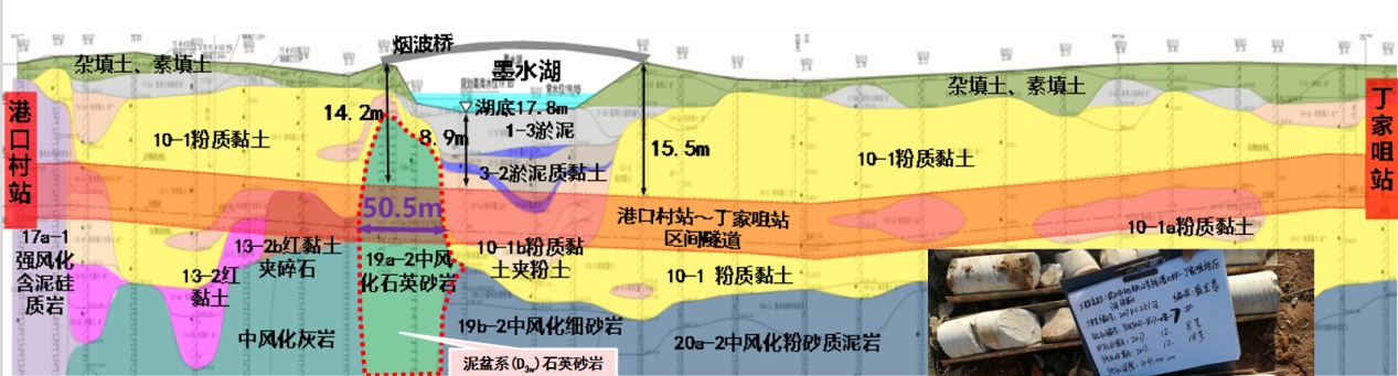 ? ? 超硬巖層、超近下穿。本項(xiàng)目設(shè)計(jì)范圍中的港口村站~丁家咀站區(qū)間隧道長(zhǎng)約1242m,采用盾構(gòu)法施工,管片直徑6.2m,需下穿墨水湖與煙波橋,該巖層號(hào)稱“磨刀石”,為武漢地鐵建設(shè)史上的最硬巖層。