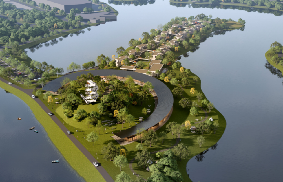 ? ? 濕地創(chuàng)展空間應(yīng)用了半島城市設(shè)計(jì)概念,與永久會址交相呼應(yīng)。建筑設(shè)計(jì)創(chuàng)意靈感來自桐湖的漁舟,猶如幾條小船從湖畔伸向水面,兼具觀展和觀景功能,將國際小鎮(zhèn)的濕地特色體現(xiàn)得淋漓盡致。濕地創(chuàng)展藝術(shù)空間為文化藝術(shù)展示展覽、交流及研學(xué)空間。