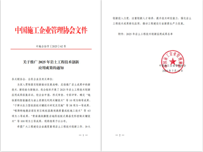 ? ? 本次獲獎成果涵蓋了深基坑支護施工、隧道施工、樁基施工、盾構(gòu)施工等多個巖土工程施工關(guān)鍵技術(shù)領(lǐng)域,每一項成果皆源于實踐及其不斷歸納、總結(jié)、提煉,每一項技術(shù)都聚焦并解決了施工現(xiàn)場的重點、難點等關(guān)鍵問題,大幅提高了工程效率與工程質(zhì)量,經(jīng)濟效益與環(huán)境效益顯著。