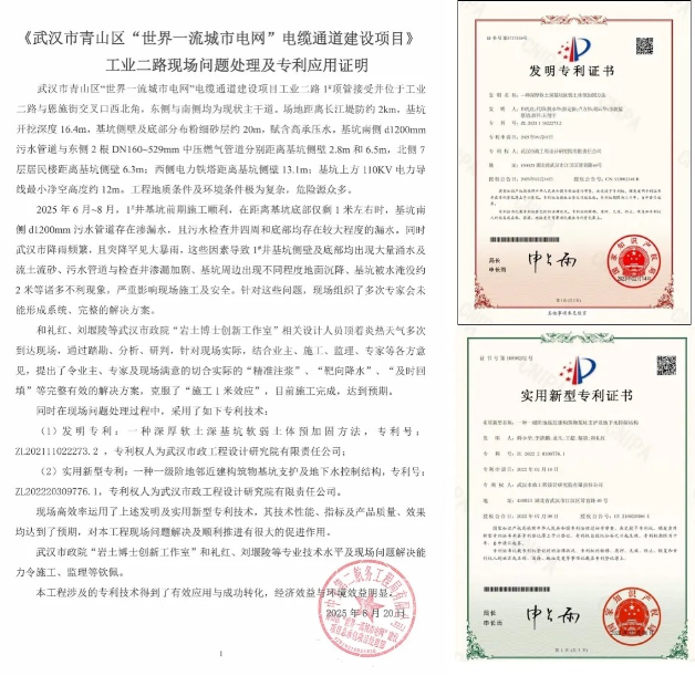 發(fā)明專利“一種深厚軟土深基坑軟弱土體預加固方法”(專利號:ZL202111022273.2)與實用新型專利“一種一級階地鄰近建構(gòu)筑物基坑支護及地下水控制結(jié)構(gòu)”(專利號:ZL202220309776.1),在武漢市青山區(qū)“世界一流城市電網(wǎng)”電纜通道建設(shè)項目——工業(yè)二路現(xiàn)場問題處理中實現(xiàn)了高效應用。兩項專利的技術(shù)性能、實施效果及產(chǎn)品質(zhì)量均達到預期目標,成功完成了技術(shù)轉(zhuǎn)化,展現(xiàn)出良好的經(jīng)濟效益與環(huán)境效益。