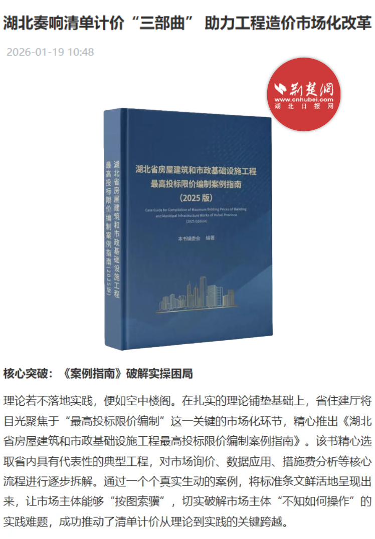 隨著《湖北省建設(shè)工程工程量清單計(jì)價(jià)指引(2026)》《湖北省園林綠化工程投資估算指標(biāo)(試行)》《湖北省房屋建筑和市政基礎(chǔ)設(shè)施工程最高投標(biāo)限價(jià)編制案例指南》以及《建設(shè)工程工程量清單計(jì)價(jià)(GB/T 50500—2024)及計(jì)算標(biāo)準(zhǔn)應(yīng)用與實(shí)務(wù)》等一系列規(guī)范與專著的陸續(xù)發(fā)布,湖北省圍繞國家標(biāo)準(zhǔn)《建設(shè)工程工程量清單計(jì)價(jià)標(biāo)準(zhǔn)》(GB/T 50500—2024)構(gòu)建的“理論解析—實(shí)操示范—規(guī)則指引”三位一體清單計(jì)價(jià)體系已正式形成,標(biāo)志著湖北省工程造價(jià)行業(yè)邁入市場化、規(guī)范化發(fā)展的新階段。近日,荊楚網(wǎng)與湖北日報(bào)網(wǎng)專題刊登了題為《湖北奏響清單計(jì)價(jià)“三部曲”助力工程造價(jià)市場化改革》的報(bào)道。