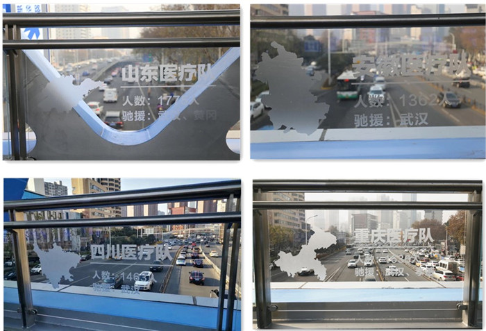 在天橋欄板上鐫刻著馳援湖北的人民解放軍醫(yī)療隊(duì)和30個省市自治區(qū)醫(yī)療隊(duì)的名稱、人數(shù)、所屬地區(qū)地圖板塊以及支援疫情地區(qū)。時值湖北武漢抗疫的關(guān)鍵時刻,全國各地的白衣戰(zhàn)士逆行而上,馳援湖北,為控制疫情、保護(hù)人民的生命安全做出了巨大的貢獻(xiàn),他們的救城之恩銘刻在每一個湖北人、武漢人的心中。