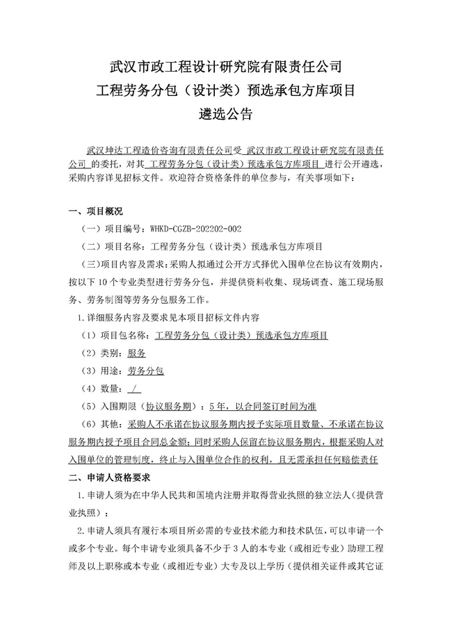 武漢市政工程設(shè)計研究院有限責(zé)任公司工程勞務(wù)分包(設(shè)計類)預(yù)選承包方庫項目遴選公告