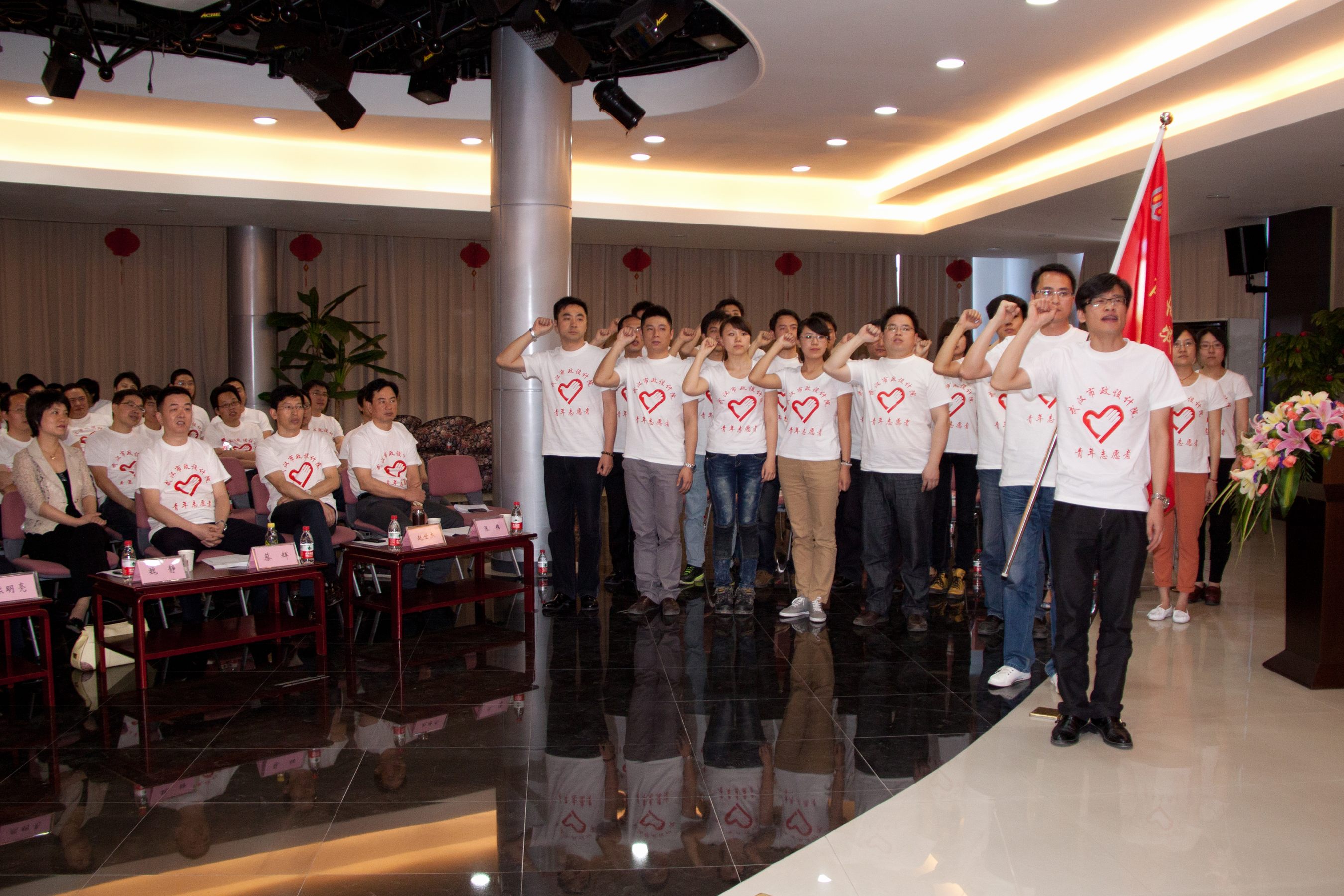 ??? 青年員工代表周鼎手持青年志愿者的旗幟走入會(huì)場(chǎng),公司青年志愿者先鋒隊(duì)成立儀式正式開(kāi)始。市城建委副主任熊明亮同志接過(guò)旗幟,并親手將其交給青年志愿者先鋒隊(duì)隊(duì)長(zhǎng)李威。20名青年志愿者代表走到會(huì)場(chǎng)前排莊嚴(yán)宣誓。隨后,公司團(tuán)總支書(shū)記張茂會(huì)鄭重宣布:公司青年志愿者先鋒隊(duì)成立。