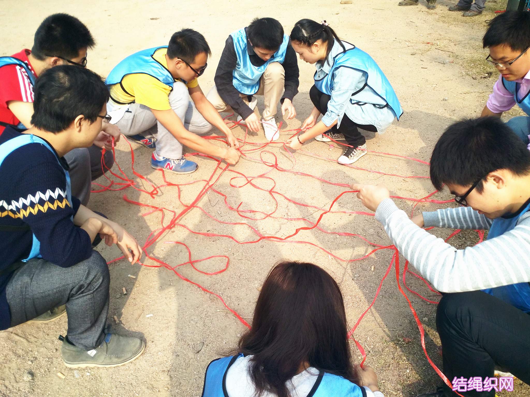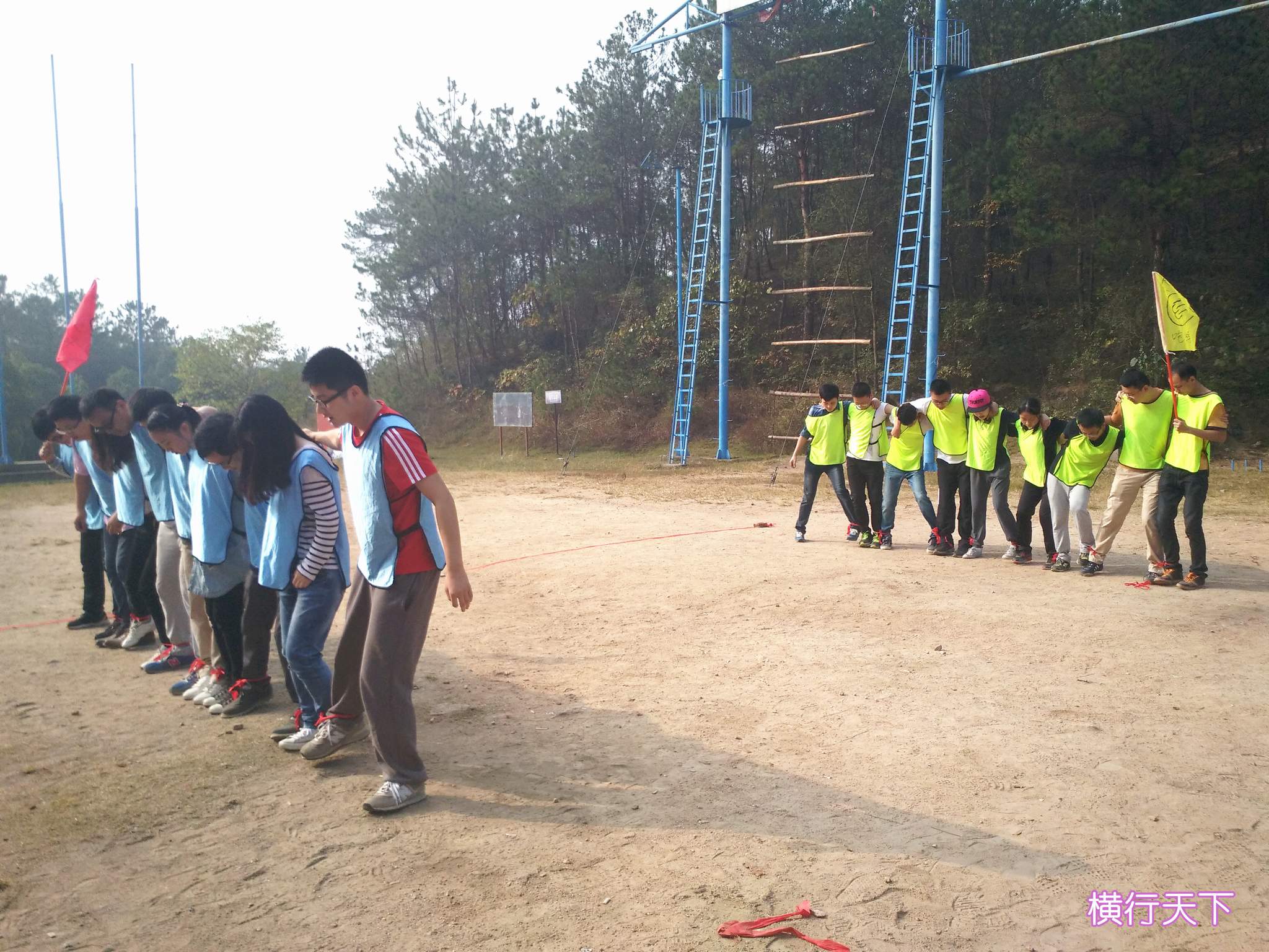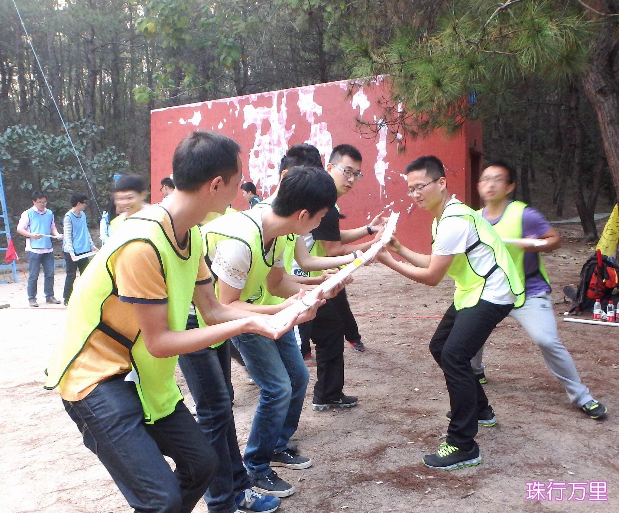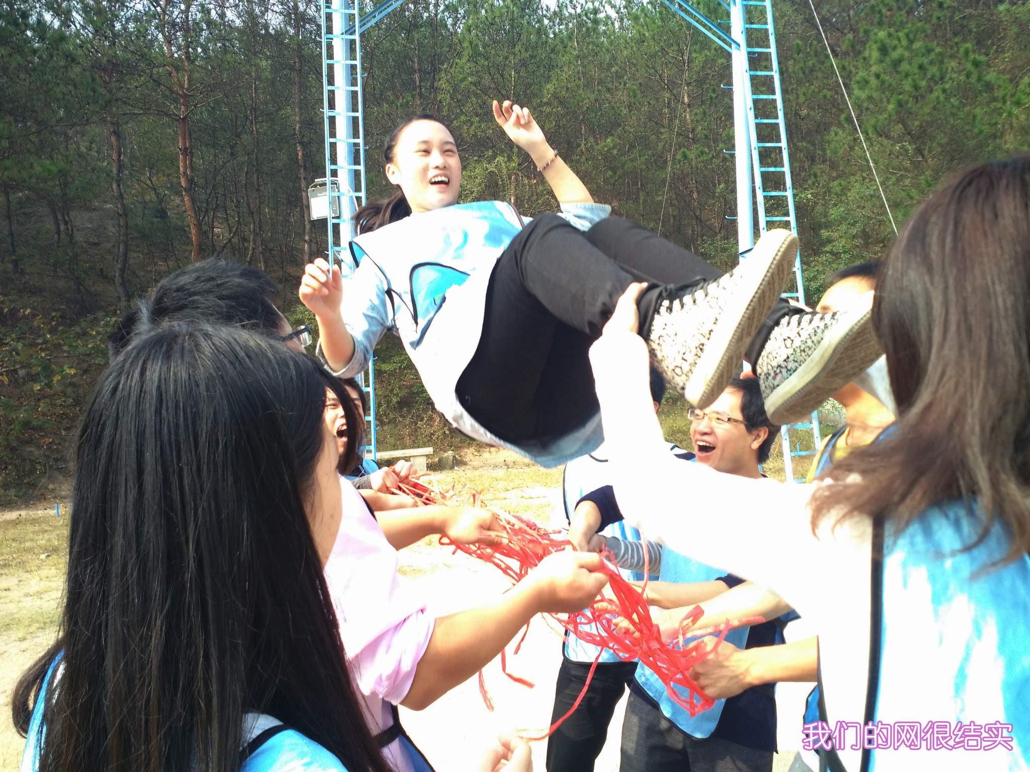 ??? 在抵達(dá)活動(dòng)地點(diǎn)進(jìn)行了簡(jiǎn)單的破冰活動(dòng)后,新員工們組成了兩支隊(duì)伍,并策劃了隊(duì)名、隊(duì)旗和口號(hào)。隨后,在教練員的帶領(lǐng)下,新員工們開始了一系列的拓展活動(dòng):“珠行萬里”,隊(duì)員們手持半圓形軌道接力將乒乓球運(yùn)到終點(diǎn),考驗(yàn)的是團(tuán)隊(duì)合作能力;“橫行天下”,多人多足的橫向移動(dòng),除了默契的團(tuán)隊(duì)配合,也需要一定的技巧;“結(jié)繩織網(wǎng)”,細(xì)細(xì)的尼龍繩結(jié)成能承受一個(gè)人重量的網(wǎng),是對(duì)動(dòng)手能力和創(chuàng)造能力的雙重考驗(yàn)。