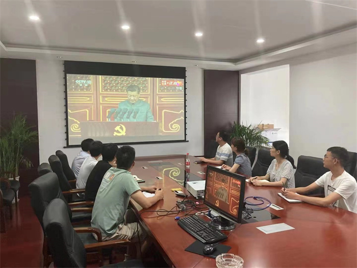 公司領(lǐng)導(dǎo)、總經(jīng)理助理、駐總院辦公的部門負(fù)責(zé)人、支部書記在西四樓會議室集中收看大會盛況。大會伊始,在轟鳴的禮炮聲中,國旗護(hù)衛(wèi)隊(duì)護(hù)衛(wèi)國旗颯爽登場;全場肅立高唱《國歌》,高亢的旋律瞬間營造了莊嚴(yán)肅穆的氛圍;少先隊(duì)員和共青團(tuán)聯(lián)合獻(xiàn)詞,回顧黨的光輝歷史,表達(dá)對黨的熱愛與忠誠。大會現(xiàn)場氣氛莊嚴(yán),激昂奮進(jìn),讓收看的人仿佛置身現(xiàn)場,親臨盛典。