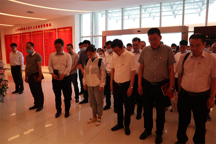 國歌唱畢,全場肅立,向在上甘嶺戰(zhàn)役中英勇犧牲的烈士默哀。默哀畢,在第三黨支部書記、地下空間設(shè)計院院長彭定新的領(lǐng)誓下,大家面對黨旗,舉起右拳,重溫入黨誓詞,重憶入黨初心。