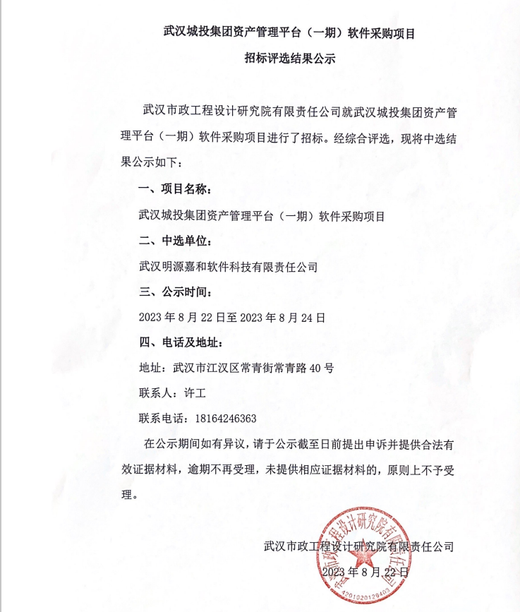 武漢城投集團(tuán)資產(chǎn)管理平臺(一期)軟件采購項目招標(biāo)評選結(jié)果公示